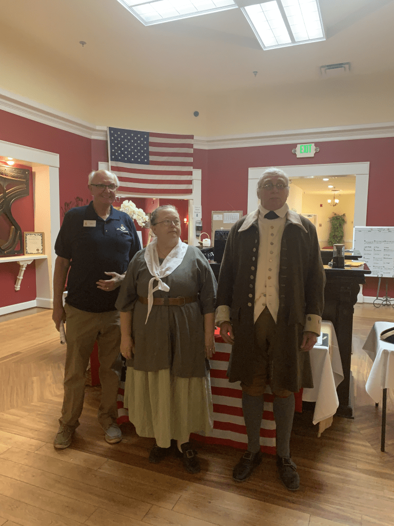 Martin and I had a blast presenting for the residents of Cedar Creek Assisted Living facility in Selma, AL. We shared about life for Rev War soldiers and for the families left at home or who became camp followers, providing various services for Washington’s Army. We were joined by Rick Wells from SAR and his wife, Donna, a DAR member, who took photos during the presentations. We met some interesting people and enjoyed our visit.