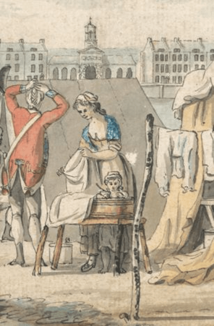 Detail from a painting by James Malton, “A Military Encampment in Hyde Park”, 1785. This woman may be doing her husband’s laundry or she may well be doing laundry in exchange for payment. It may be insufferably hot. Maybe she’s doing her own laundry and hasn’t a clean kerchief. We don’t know why she isn’t wearing this clothing item but there is nothing else that would indicate any untoward behavior. Never say Never or make assumptions without knowing the details of what is depicted. This scene is outdoors in the presence of many people. This is a detail cropped from the painting to show that there are women not wearing neckerchiefs. In the painting, there is a minister standing off to the right, Bible in hand, and this young man seems to be trying hard to persuade his lady love to marry him much to the dismay of the woman who may be her mother.