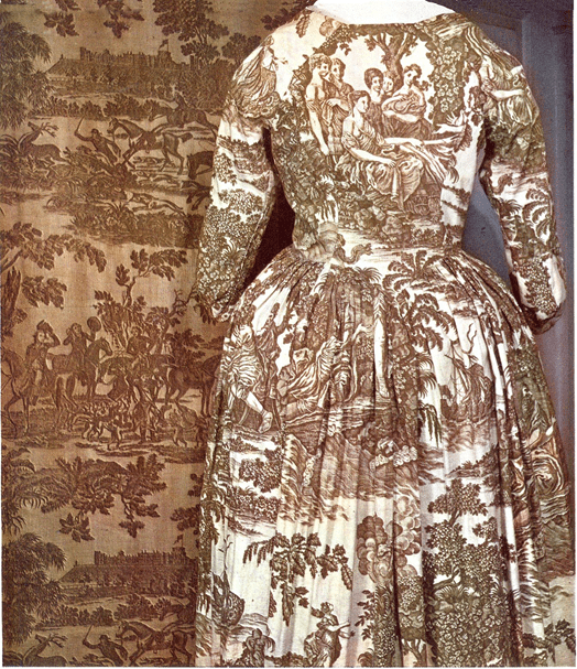 This toile dress, ca. 1780, was found in the Showshill Collection of 18th century original clothing. While extremely rare, and under questionable circumstances, at least one such dress exists.