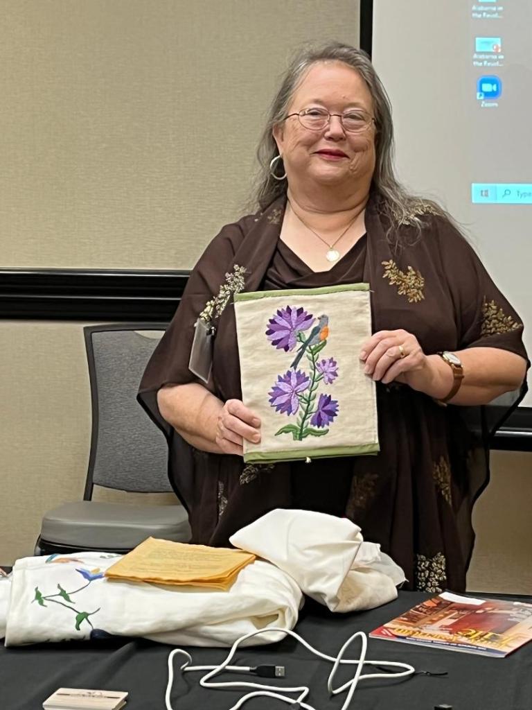 I had the pleasure of speaking with the SAR Ladies Auxiliary at the February 2022 state SAR conference about 18th century embroidered clothing and accessories. Carol Irving assisted with the projector and photos. I shared the history of the art and photos of original garments along with embroidered clothing and accessories from my own collection. For information: thistledewbooks [at] yahoo.com.